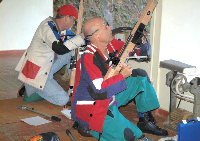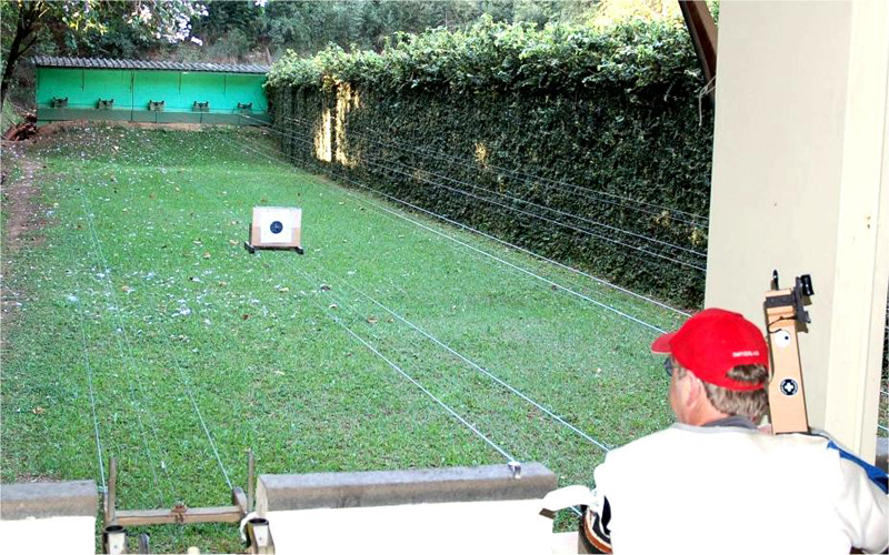 Iniciantes na prática do tiro, quando em fase de treinamento, se utilizam de cavaletes para apoio, até que a ambientação com a arma permita seu uso posterior, sem nenhum apoio fixo. À direita, atirador em treino, enviando o alvo de volta à sua posição de tiro à 30 metros. Note que a área de tiro é geralmente ladeada por muros ou plantas para diminuir a ação dos ventos laterais.