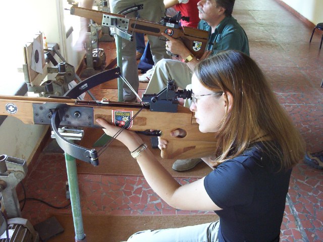 Atiradora a postos em competição realizada na Suíça, utilizando um Armbrust de fabricação da casa Walther AG.