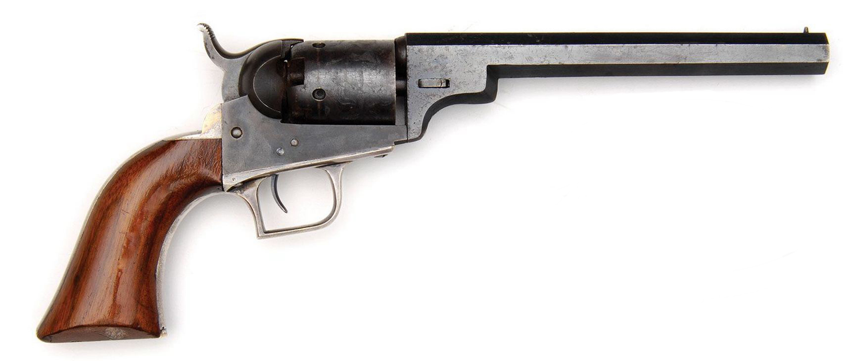 Um dos revólveres modelo Walker fornecidos ao Exército em 1847; não havia no mundo, na época, arma curta de repetição mais potente que esse revólver. Note a alavanca de carregamento sem um retém na sua extremidade, que permitia seu movimento involuntário. O guarda mato era do tipo quadrado. Note o parafuso lateral que fixa a chaveta de desmontagem e a inscrição U.S. 1847.