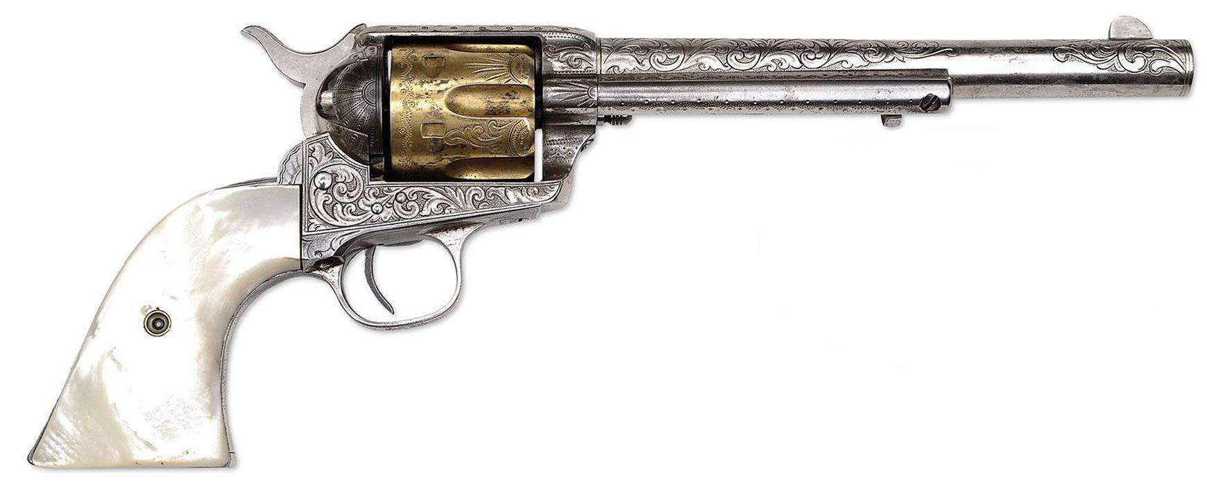 A Colt possuiu durante muitos anos uma equipe de artistas e gravadores de primeira linha; seus modelos “De Luxo” fizeram fama na época, e portar um Colt ricamente ornamentado era símbolo de status e de boa condição financeira. O modelo acima. o Peacemaker com cano de 7 1/2″ tem o tambor folheado à ouro e talas de empunhadura em marfim.