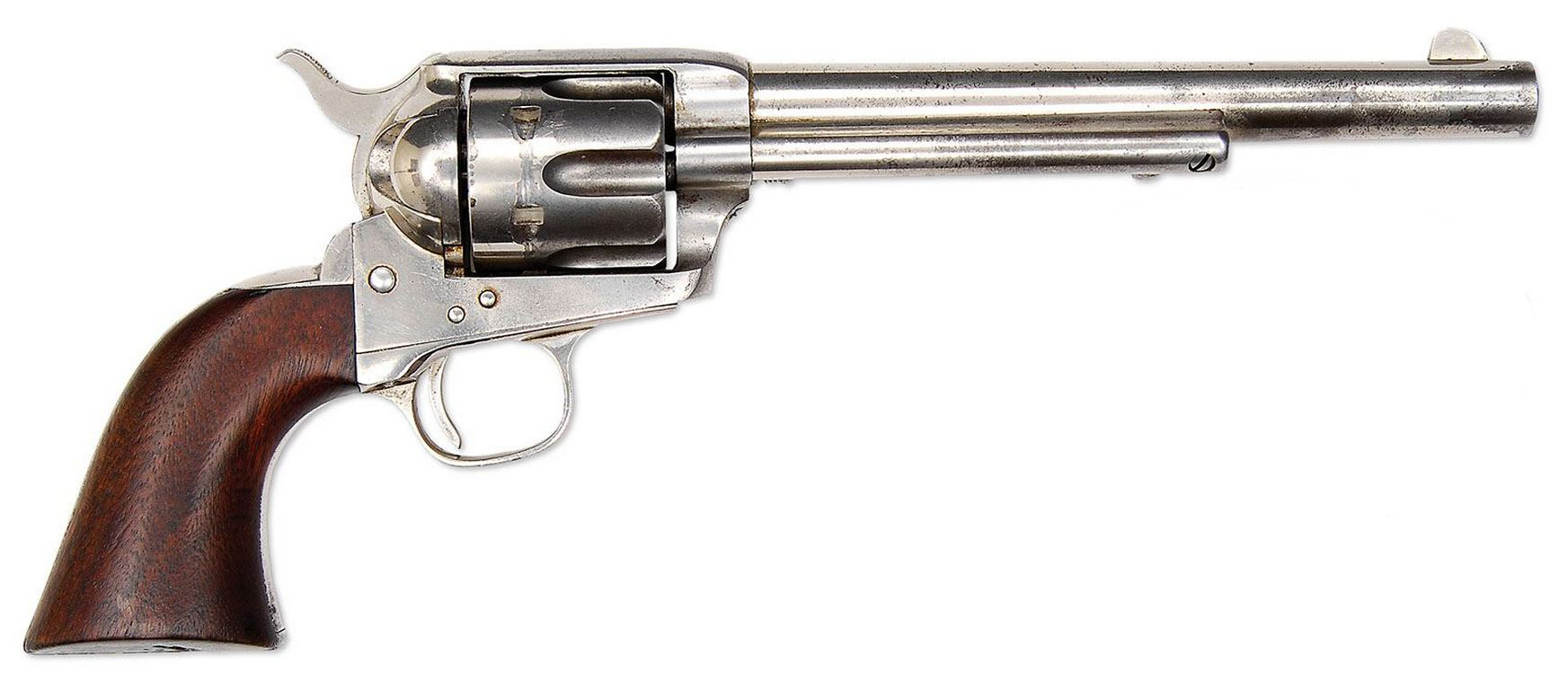 O Colt Single Action Army de 1873, em calibre .45 Long Colt, “The Gun that Won the West” (A Arma que Conquistou o Oeste) – o modelo acima, com cano de 7 1/2″ era denominado de Peacemaker.